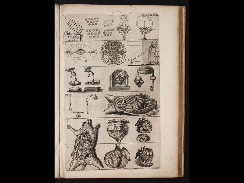 Caramuel’s Mathesis Biceps (“Two-Headed Mathematics”) was published in 1670, and, with its two fat text volumes and a third volume of plates, it is one of the most complete encyclopedias of the mathematical sciences published in the 17th century. We have a fine set in our History of Science Collection. A selection of plates (see images above) shows us that mathematics was very broadly construed by Caramuel, since in addition to geometrical diagrams and pictures of mathematical instruments, there are musical scales, dissected cats, fortification plans, magnetic fields, and cosmological diagrams.