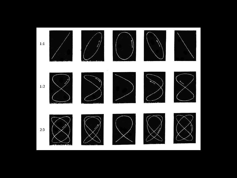 Lissajous was working with sound waves-- with sound produced by tuning forks, to be specific. He discovered that if you attach a tiny mirror to a tuning fork, and bounce a light beam off it and onto the wall, you get a visual display of the vibration (a sine wave, in fact, just like on the oscilloscope). And then he found that if you reflect the light from the first fork onto a mirror on a second tuning fork, tilted 90ᵒ to the first, and then onto the wall, you get something quite different--a perfect circle. That would have been the case if the two forks were identical in frequency. But if one vibrated a little faster than the other, then the circle would oscillate, becoming an ellipse, a diagonal line, an ellipse again, and then back to a circle. This was the first Lissajous figure (see first image; the figure in the illustration is actually Lissajous himself, and he views his figures with a microscope, instead of projecting them on the wall). If the frequencies are double or triple one another, you get entirely different figures, and if the frequencies are not exactly even multiples, the figures will rotate slowly or oscillate. The third image shows just a few of the thousands of possible Lissajous patterns.