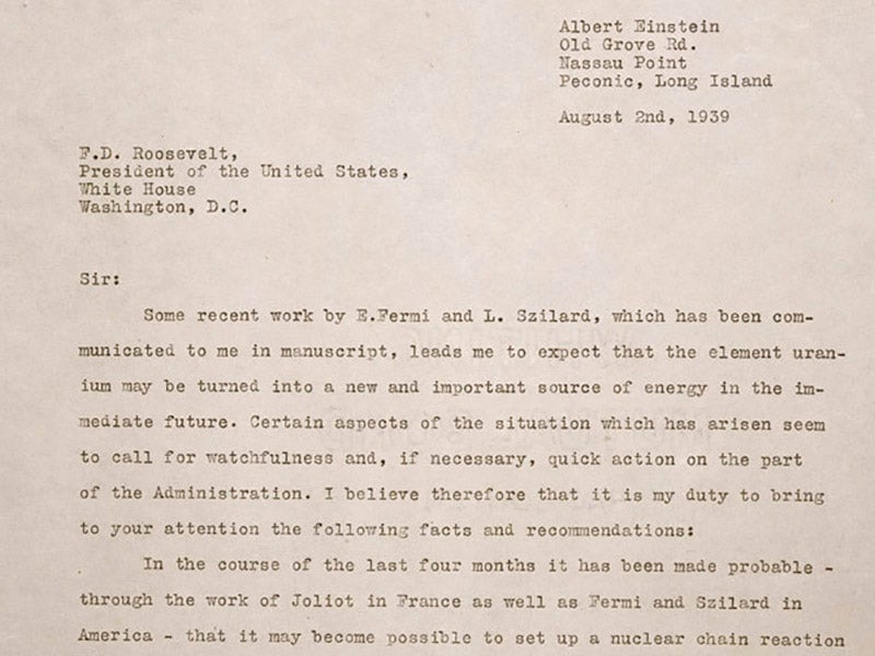 Some time later, in August of 1939, Szilard came to Princeton to talk to Albert Einstein, and Szilard convinced Einstein to send a letter to President Roosevelt (which Szilard had already drafted), stressing the importance of initiating work on an atomic bomb. As a result, the Manhattan Project was launched. There is a famous Life magazine photograph that captures this momentous meeting between Einstein and Szilard, even if it was a re-enactment (first image). The beginning of the letter is shown in the second image.