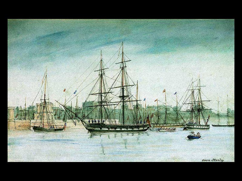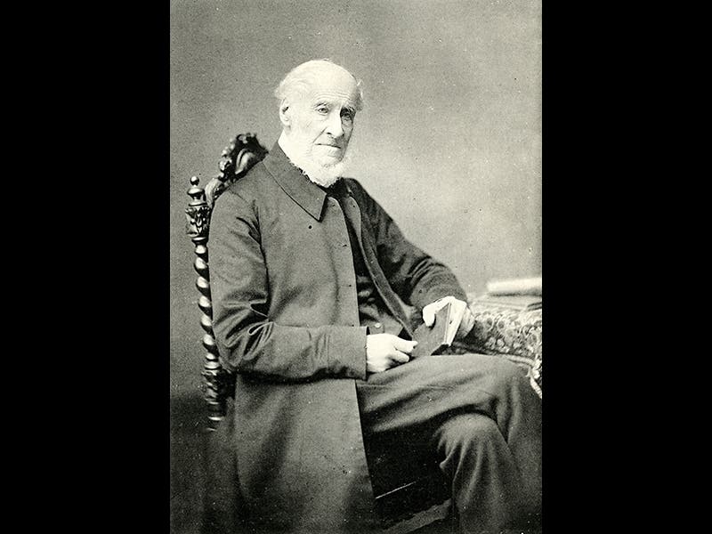 Leonard Jenyns, an English naturalist and clergyman, was born May 25, 1800. Although Jenyns had a perfectly respectable career on his own, he is most often remembered for the three instances in which his life intersected that of Charles Darwin. First, Jenyns was the man who turned down an offer to accompany Captain Fitzroy as companion-naturalist on the voyage of HMS Beagle (first image), creating the opportunity for Darwin to do so instead. Second, when Darwin returned from the Beagle voyage in 1836 and was looking for experts to analyze and describe his collections, he settled on Jenyns to describe his fish specimens. The fish volume, part 4 of the Zoology of the Voyage of the Beagle, written by Jenyns and edited by Darwin, appeared in 1842, and we have a copy (indeed, we have the entire 5-volume set) in our History of Science Collection. The second image above is an actual fish brought back by Darwin and described by Jenyns, as preserved at Cambridge. The third image shows a printed image of a Falkland Islands fish, in Jenyns’ Fish volume of the Zoology set.