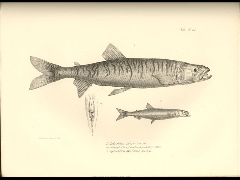 Leonard Jenyns, an English naturalist and clergyman, was born May 25, 1800. Although Jenyns had a perfectly respectable career on his own, he is most often remembered for the three instances in which his life intersected that of Charles Darwin. First, Jenyns was the man who turned down an offer to accompany Captain Fitzroy as companion-naturalist on the voyage of HMS Beagle (first image), creating the opportunity for Darwin to do so instead. Second, when Darwin returned from the Beagle voyage in 1836 and was looking for experts to analyze and describe his collections, he settled on Jenyns to describe his fish specimens. The fish volume, part 4 of the Zoology of the Voyage of the Beagle, written by Jenyns and edited by Darwin, appeared in 1842, and we have a copy (indeed, we have the entire 5-volume set) in our History of Science Collection. The second image above is an actual fish brought back by Darwin and described by Jenyns, as preserved at Cambridge. The third image shows a printed image of a Falkland Islands fish, in Jenyns’ Fish volume of the Zoology set.