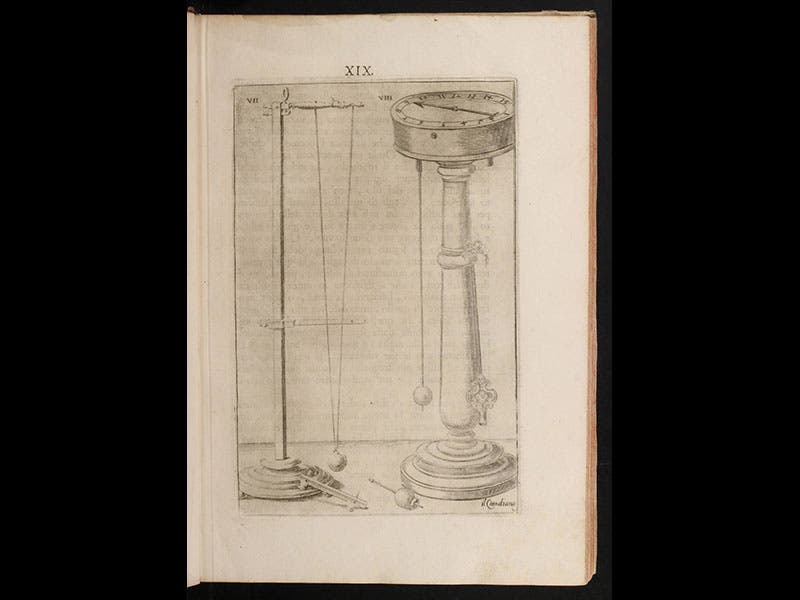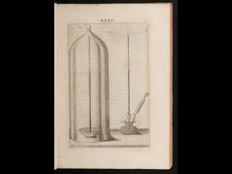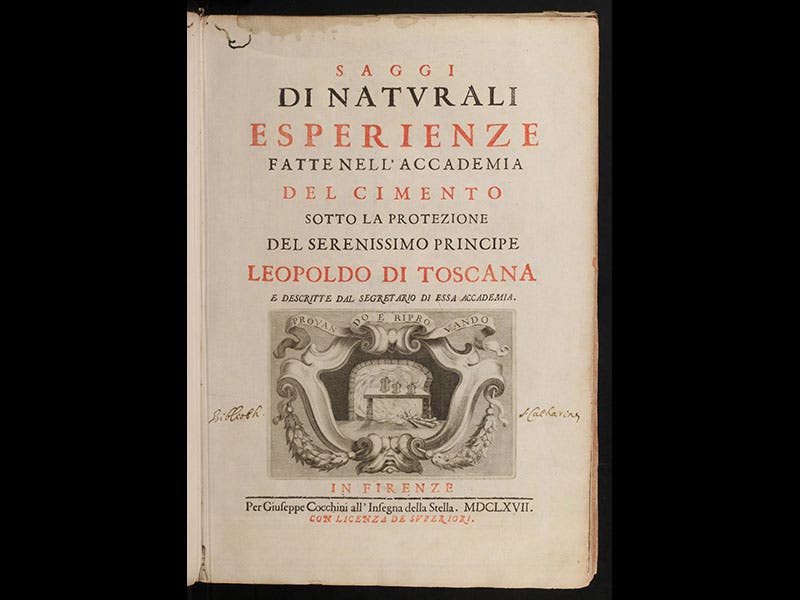 The Cimento Academy had a motto “(provando e riprovando”, “test and test again”) and a crest (second image) and a secretary to record the results of their experiments. It is often called one of the first scientific societies, and in some ways it was, but one must always remember that the members were selected by Leopoldo, and the experiments and demonstrations were chosen to meet Leopoldo's desires, so in many ways it was more of a patron's circle than an independent scientific organization. But Leopoldo chose his members well, and the Cimento group included such distinguished investigators as Giovanni Alfonso Borelli and Francesco Redi and, for a short time, the geologist Nicolas Steno. Not surprisingly, when Leopoldo lost interest after ten years, and sought (successfully) to become a Cardinal in the Church, the Academy folded up its tent. Fortunately, Leopoldo encouraged the secretary, Lorenzo Magalotti, to publish an account of the experiments that were performed over the course of ten years, and the Saggi di naturali esperienze appeared in 1667 (second, fourth, fifth images). It was a considerable ornament to Leopoldo and the Tuscan court, and a milestone in the history of experimental science. We have four editions of the Saggi, including the first, in our History of Science Collection.
