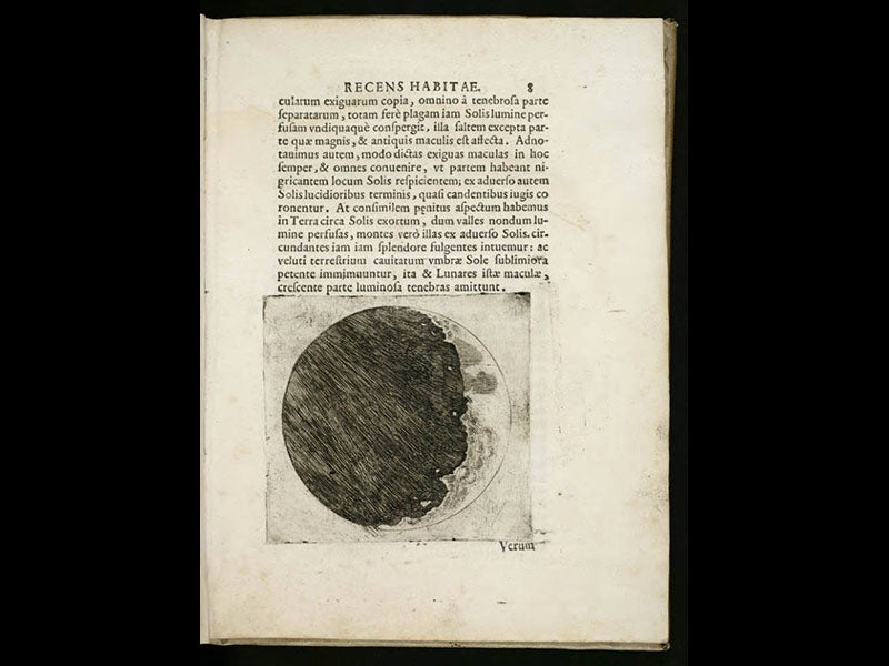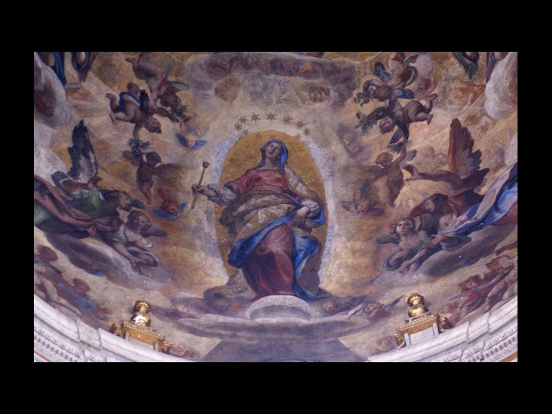Cigoli knew all about this recent revelation, so while he accorded with tradition and drew his Pauline Virgin standing on the Moon, it was not a pure moon that he painted, but rather a Galilean moon, pockmarked with craters (third image). In a close-up of Cigoli’s Virgin (fourth image), the cratered moon is evident. It is hard to know what Church authorities thought about this. They were probably just grateful that the blemished moon was tucked away at the side of a lofty dome and difficult to see from the floor of the chapel. Thankfully, they left it alone, so one can still see this wonderful example of art reflecting scientific novelties, if one knows where to look.