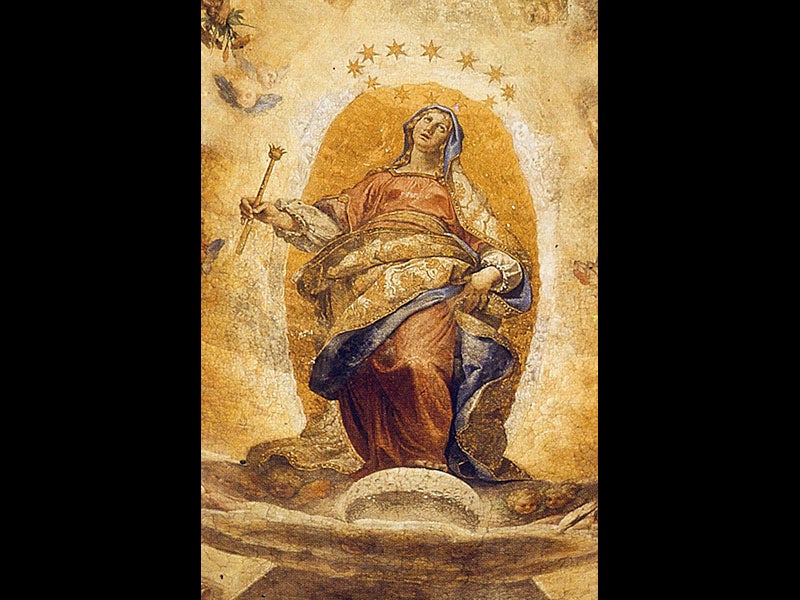 Lodovico Cardi, an Italian painter usually known as Cigoli, was born Sep. 12, 1559 (see self-portrait, second image). Cigoli was a good friend of Galileo Galilei, both being members of the Accademia del Disegno, the artists’ guild in Florence. One of Cigoli's last commissions (in 1612, the year before his death) was to paint the dome of the Pauline Chapel in the church of Santa Maria Maggiore in Rome (first image). In this long view, one can see a small figure, just above the bottom rim of the dome. That scene depicts the Assumption of the Virgin, a common theme in Italian Baroque art, where Mary is shown being escorted bodily into heaven by a host of angels. Often, in paintings of the Assumption, the Virgin was depicted standing on the Moon, since the Moon, like Mary, was an immaculate celestial body. Or so it was thought to be until November of 1609, when Galileo turned his telescope on the Moon and discovered that the lunar surface was "maculata"--covered with spots, which Galileo saw as craters (fifth image).