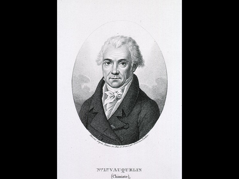Vauquelin’s original paper on chrome yellow appeared in the Annales de Chimie for 1809, which we have in the Library’s serials collection. It is not, alas, illuminated with chrome yellow illustrations. There are a number of engraved portraits of Vauquelin in the National Library of Medicine; we display above the one we like the best (fourth image).