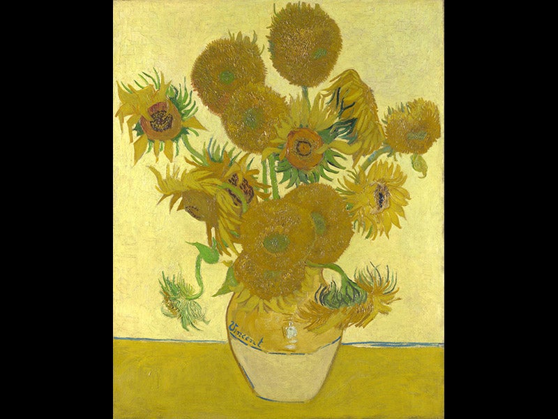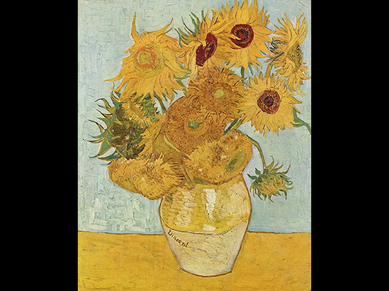 Vincent Van Gogh loved chrome yellow, especially for his sunflowers. There are many Van Gogh sunflower still lifes; we see above one in the Neue Pinakothek in Munich (first image). Unfortunately, chrome yellow has a tendency to darken over time and turn a deep brown, and to worsen the problem, Van Gogh sometimes mixed his yellow with white, which hastens (we now know) the process of pigment deterioration. Thus many of his sunflowers now look like the one in the National Gallery in London (third image). Chemists have been studying the problem, and there is apparently some hope that the browning process can be slowed down, but unfortunately, it cannot be reversed. For this reason, and because chrome yellow is toxic, most artists now rely on cadmium yellow for their sunflowers.