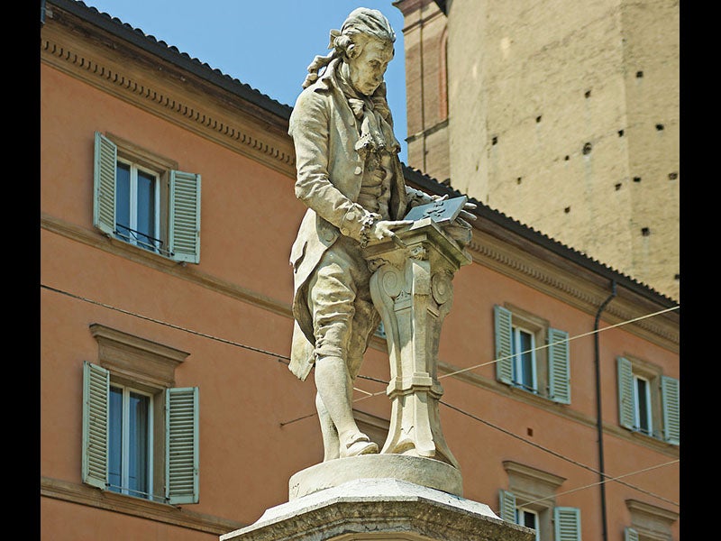 A statue of Galvani, admiring a frog, stands in Piazza Luigi Galvani in Bologna (fifth image).