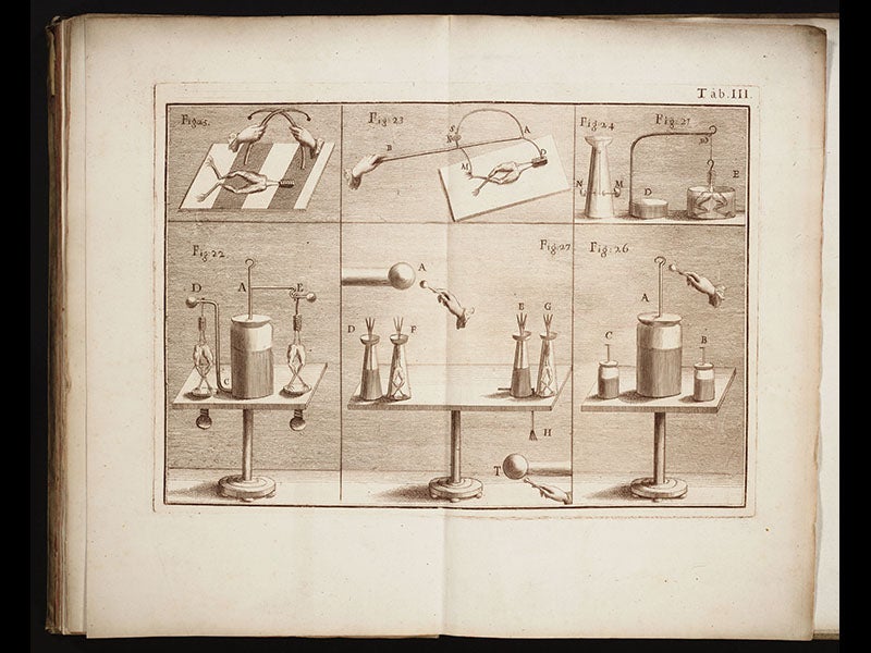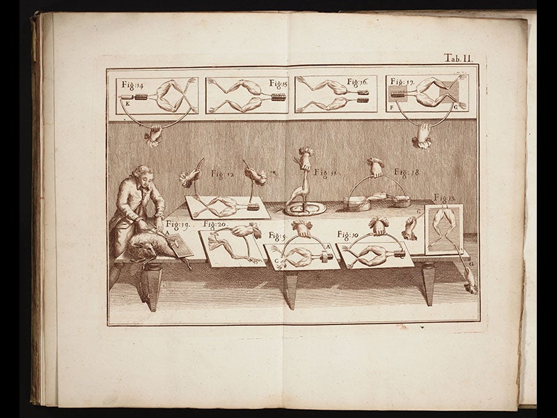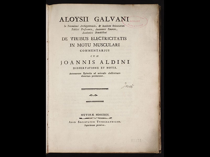 Galvani announced his results in a long 56-page paper, “De viribus electricitatis in motu musculari commentarius” that appeared in the Commentaries of the Bologna Institute of Science in 1791. We do not have this serial in our Library. In 1792, the paper was released in book form, with three plates re-engraved from the 1791 originals. We acquired the 1792 edition earlier this year, and you can see the three plates, and the title page, above. In our copy (and a few others), the plates are printed in sepia rather than black ink, which makes them especially attractive.