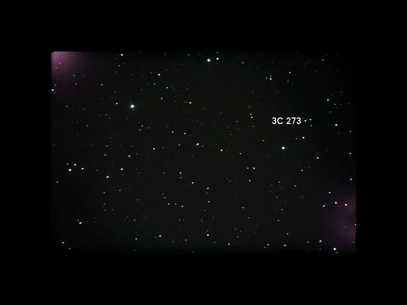 Quasars like 3C 273 were mysterious because they had an unrecognizable spectrum. When you spread out the light from most star-like objects, one sees three prominent spectral lines due to hydrogen, but the lines from quasars did not conform to the standard pattern, and no one could figure them out. Until Schmidt, on Feb. 6, 1963, truly saw the light. He was pondering the spectrum of 3C 273, when he wondered: what if the spectrum had been drastically red-shifted, so that the visible lines are those that, in most light sources, are actually invisible in the ultraviolet region? He rapidly did some calculations and realized that if you took ordinary light and shifted it to the red by a factor of 16%, you would produce the exact spectrum of 3C 273 (you can see the actual spectrum of 3C 273 above (third image), with a comparison spectrum below, and the hydrogen spectral lines labelled and shifted). And because of Hubble’s law that equates red shift with recession velocity, this means that 3C 273 is moving away from us at 16% the speed of light, or about 30,000 miles a second, the fastest moving object ever recorded to that time. And it further means that 3C 273 is over 2 billion light years away, making it the most distant object in the universe detected up to that time.