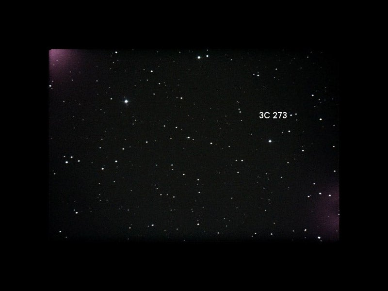 Maarten Schmidt, a Dutch/American astronomer, was born Dec. 28, 1929. In 1960, a new kind of deep-space object, known as a quasar, was discovered. Quasars are intense sources of radio energy, yet they are barely perceptible as points of light, hence the name: QUASi-stellAR radio source. The first photo above shows 3C 273, the quasar that Schmidt would make famous, as viewed by the Hubble Space Telescope, but to most other viewers it is a quite undistinguished object, as you can see in the wide-field photograph above (second image), where it is the dot just to the right of the “3” in the 3C 273 label.