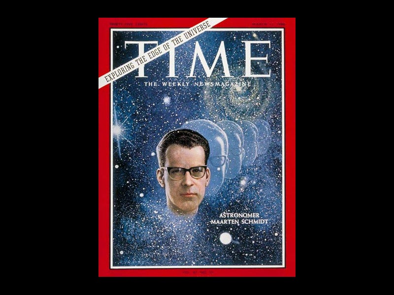 Schmidt is 87 years old today. He should have been awarded a Nobel Prize for his discovery, but since there is no Nobel Prize for astronomy, he has had to settle, like all high-achieving astronomers, for being on the cover of Time Magazine in 1966 (fourth image), and for the Bruce Medal, which he received in 1992.