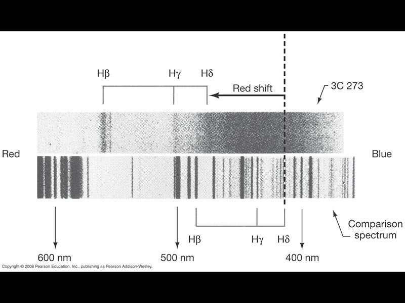 Quasars like 3C 273 were mysterious because they had an unrecognizable spectrum. When you spread out the light from most star-like objects, one sees three prominent spectral lines due to hydrogen, but the lines from quasars did not conform to the standard pattern, and no one could figure them out. Until Schmidt, on Feb. 6, 1963, truly saw the light. He was pondering the spectrum of 3C 273, when he wondered: what if the spectrum had been drastically red-shifted, so that the visible lines are those that, in most light sources, are actually invisible in the ultraviolet region? He rapidly did some calculations and realized that if you took ordinary light and shifted it to the red by a factor of 16%, you would produce the exact spectrum of 3C 273 (you can see the actual spectrum of 3C 273 above (third image), with a comparison spectrum below, and the hydrogen spectral lines labelled and shifted). And because of Hubble’s law that equates red shift with recession velocity, this means that 3C 273 is moving away from us at 16% the speed of light, or about 30,000 miles a second, the fastest moving object ever recorded to that time. And it further means that 3C 273 is over 2 billion light years away, making it the most distant object in the universe detected up to that time.
