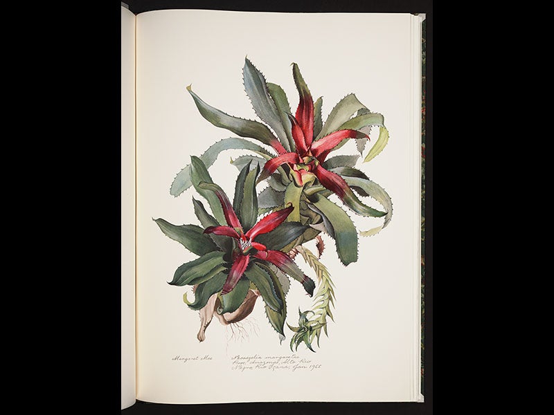 Margaret Ursula Mee, an English botanical artist and environmentalist, was born May 22, 1909. She moved to Brazil in 1952, and in 1956 she engaged in her first painting expedition into the Amazon rainforest, an activity she would pursue for over 30 years. She usually travelled alone, with locals as guides, and she did most of her painting on site. She also witnessed the growing deforestation of Amazonia and soon began actively working to call attention to the devastation being wrought by commercial interests, and to the plight of the indigenous peoples. Her paintings attracted an international following, allowing her to support herself and her environmental activism with her art. In 1968, she published her first collection of prints from her paintings, Flowers of the Brazilian Forests. There are only 32 prints in the volume, and they are photographically reproduced, but the large folio was the handiwork of a fine arts press in Amsterdam and was beautifully produced, and we were happy to acquire a copy just last year.