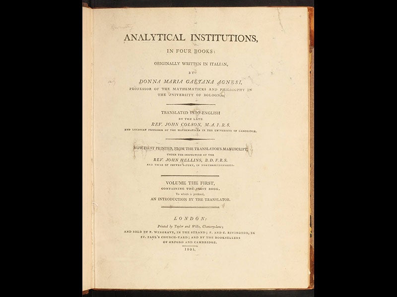 Maria Gaetana did not much like the attention her mathematical fame brought her, preferring to serve God by helping the poor, and as soon as her father died, she gave up her academic work and devoted the last 50 years of her life to charity, dying in total poverty in 1799 in an institution for the poor that she founded and directed. We have a lovely untrimmed copy of her Instituzioni in the History of Science Collection, as well as a copy of the English translation of 1801 that turned Agnesi’s versiera into the “witch” (second image). Former Library Fellow Dr. Cynthia Huffman wrote a piece on Agnesi for the Mathematical Association of America website, in which she displayed a number of photos from our two copies; you may see her article here. Cynthia perceptively noticed that the translator for the 1801 edition, John Colson, not only transformed versiera into witch, but he converted the calculus notation from the Leibniz style of the Italian edition to Newtonian notation for the English translation.