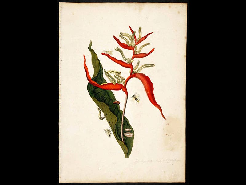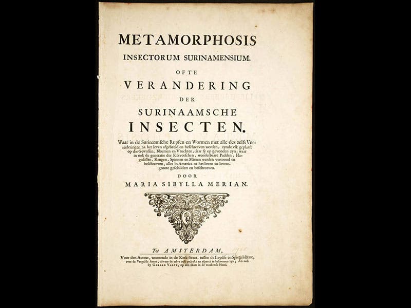 Maria Sibylla Merian, a German artist, was born Apr. 2, 1647. Maria was the daughter of Matthaeus Merian, an engraver and artist of Frankfurt, and she was trained as a painter. As a young girl she was fascinated by caterpillars and their transformation into butterflies and moths, a strange passion, but one that she would never lose. After a marriage that ended in divorce, but which produced two loving and artistically talented daughters, Maria decided, at the age of 52, to undertake a trip to Surinam in South America, where the Dutch had long maintained a colony. Accompanied by her younger daughter (the elder daughter had married), Maria spent all her waking hours drawing the flowers and foliage, as well as the insects and caterpillars, of the tropics. She planned to stay for 5 years, but when her health came under attack after less than two years, probably from malaria, she returned home and started converting her paintings into engravings for publication. The Metamorphosis of the Insects of Surinam appeared in print in 1705, and it is one of the great natural history books of all time, as well as the first significant scientific book published by a woman in the West. Each of the 60 plates depicts a plant, usually in multiple stages of flowering and fruiting, as well as at least one insect, also in various stages of metamorphosis. Five plates, selected more or less at random (they are all spectacular) may be seen above.