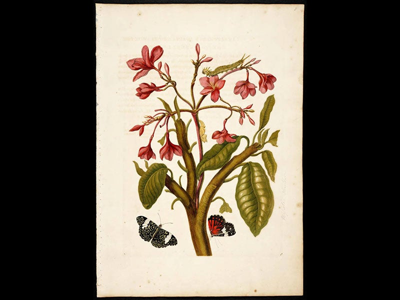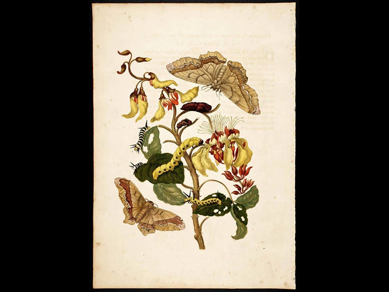 Maria Sibylla Merian, a German artist, was born Apr. 2, 1647. Maria was the daughter of Matthaeus Merian, an engraver and artist of Frankfurt, and she was trained as a painter. As a young girl she was fascinated by caterpillars and their transformation into butterflies and moths, a strange passion, but one that she would never lose. After a marriage that ended in divorce, but which produced two loving and artistically talented daughters, Maria decided, at the age of 52, to undertake a trip to Surinam in South America, where the Dutch had long maintained a colony. Accompanied by her younger daughter (the elder daughter had married), Maria spent all her waking hours drawing the flowers and foliage, as well as the insects and caterpillars, of the tropics. She planned to stay for 5 years, but when her health came under attack after less than two years, probably from malaria, she returned home and started converting her paintings into engravings for publication. The Metamorphosis of the Insects of Surinam appeared in print in 1705, and it is one of the great natural history books of all time, as well as the first significant scientific book published by a woman in the West. Each of the 60 plates depicts a plant, usually in multiple stages of flowering and fruiting, as well as at least one insect, also in various stages of metamorphosis. Five plates, selected more or less at random (they are all spectacular) may be seen above.