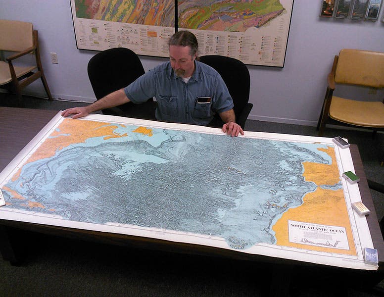By 1957, Tharp had finished a map of the entire Atlantic Ocean floor, the first ever, and the mid-Atlantic ridge, with its central rift valley, stood out prominently. We see three photos of this map above; one on a table for scale, one showing the entire map, and one providing a detail of the central portion of the map and the mid-Atlantic ridge (third image). A fourth photo (fourth image) shows Marie working on the map (OK, she is posing with the map), and one can see, propped up in the back, a chart with the first six profiles that she compiled in 1952, the ones that first showed the existence of the rift valley.