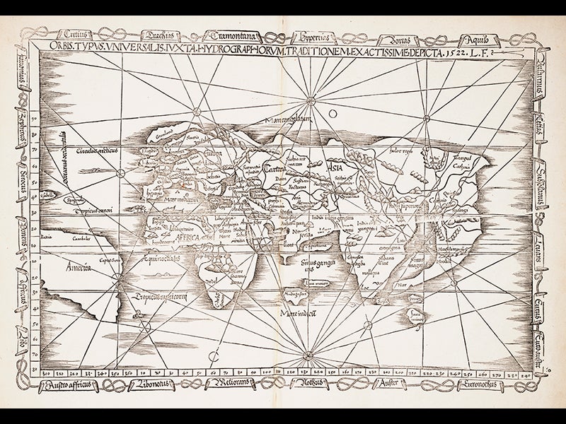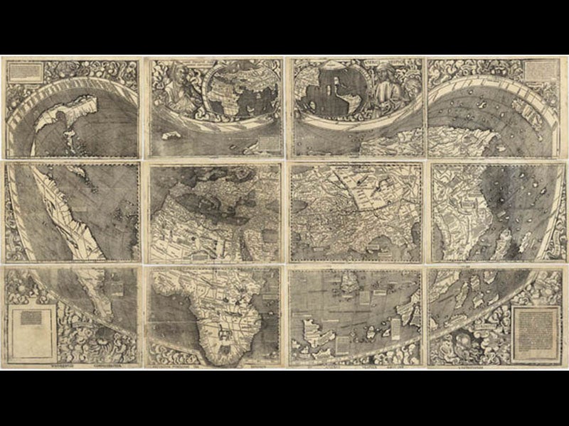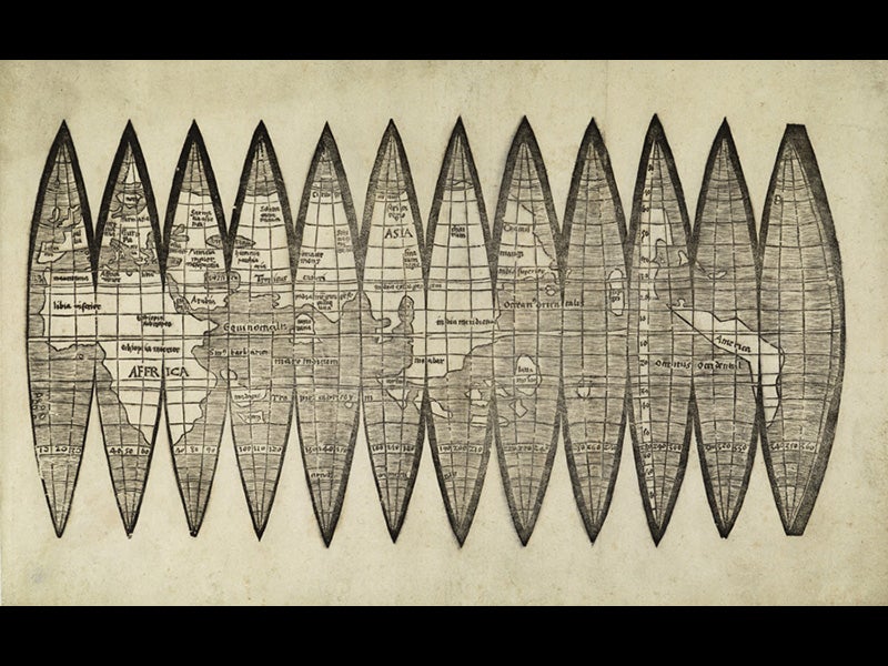 Only one copy of the map survives, and it was acquired in 2001 by the Library of Congress, where you can see it today (third image above). Waldseemüller also published a small globe in 1507 to accompany the large wall map; it was printed in the form of gores, which can be cut out and pasted on a sphere of the proper size to form a globe, and it also features the label “America” on the sliver of a new world. A sheet of 1507 gores is almost as scarce as the wall map; only three survive, and there is only one set in this country, at the James Ford Bell Library at the University of Minnesota (fourth image above).