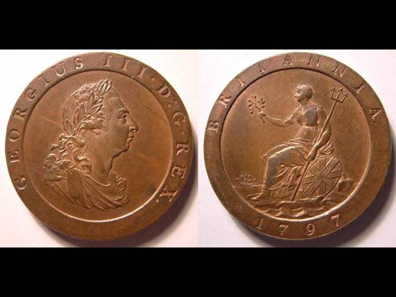 At his Soho Manufactory, Boulton produced a wide variety of decorative objects, including silver ware and gold ormolu; he also installed steam-driven presses at the factory and began turning out copper coins which were much finer and more counterfeit-proof than those that came out of the Royal Mint. We see above a specimen of the first British copper penny, minted by Boulton in 1797 and known as the cartwheel penny (third image).