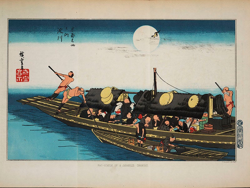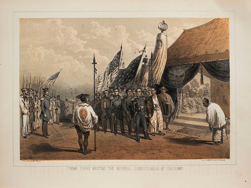 Matthew Calbraith Perry, a Commodore in the U.S. Navy, was born Apr. 10, 1794. In 1852, Commodore Perry set off with a squadron of ships for Japan. For 250 years, throughout the Tokugawa shogunate, Japan had maintained a strict isolationist policy toward the West, and any attempts by mercantile countries to trade or interact with Japan were immediately quashed. So the United States finally forced the issue, sending Perry and an armada to demand that Japan open its ports to western ships. In this he was successful, as he and the shogun signed the Kanagawa Convention in 1854, which allowed the United States access to Japanese ports and effectively ended Japanese isolationism. All of this would be for naught in a scientific anniversary, were it not that, after Perry's successful return, the U.S. Congress awarded him $20,000 by way of thanks, which sum Perry spent on hiring a writer-collaborator and publishing a three volume Narrative of the expedition. It is a lovely set. No expense was spared on the illustrations, which are mostly tinted lithographs, depicting the ports of call, the Japanese people, and their technology. We have two copies of the Narrative in our History of Science Collections, and we displayed one of them in our 2013 exhibition on lithography, Crayon and Stone, which is not yet available online.
