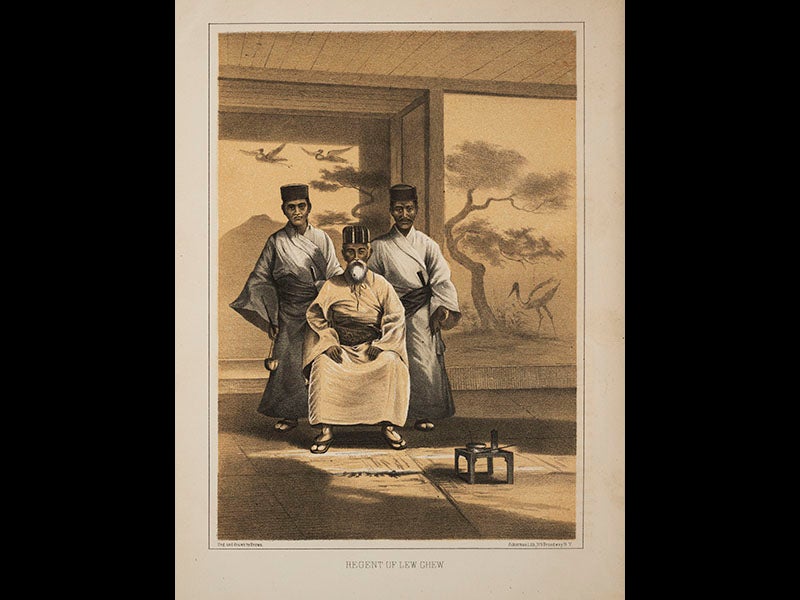 The images above, all taken from Francis Hawks, Narrative of the Expedition of an American Squadron to the China Seas and Japan, Performed in the Years 1852, 1853, and 1854, under the Command of Commodore M. C. Perry (1856), depict, in order: an irrigating device powered by a water buffalo; a buffalo-powered grindstone; three Confucians encountered by Perry in Okinawa; a scene of Perry meeting the Royal Commissioners, and a facsimile of a Japanese painting.