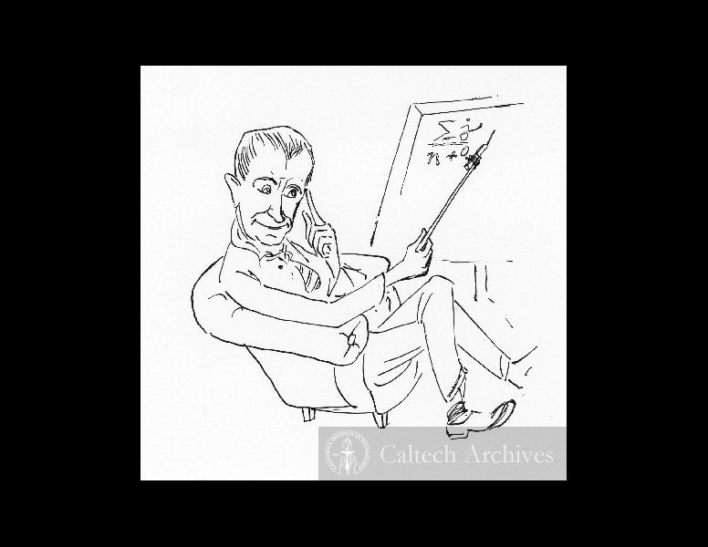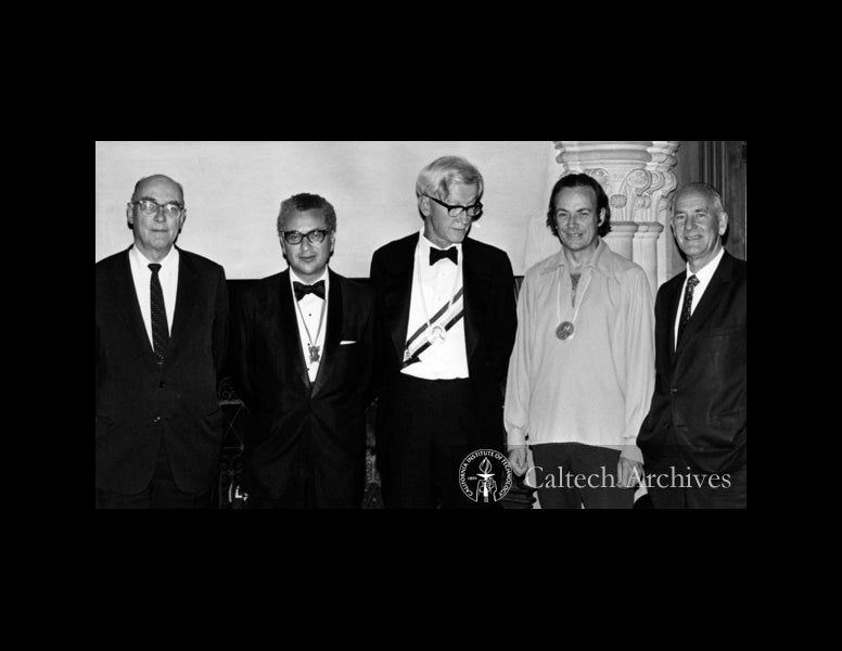 The images above show, in order: Delbrück riding a bicycle at Caltech; a caricature of Delbrück in the Caltech archives; Delbrück (standing) with Luria in 1941. The last photo, taken in 1969, shows 5 Caltech Nobelists at one gathering; Delbrück is in the center, either admiring Richard Feynman’s medal, or wondering, “How come I had to wear a suit?”