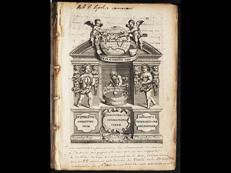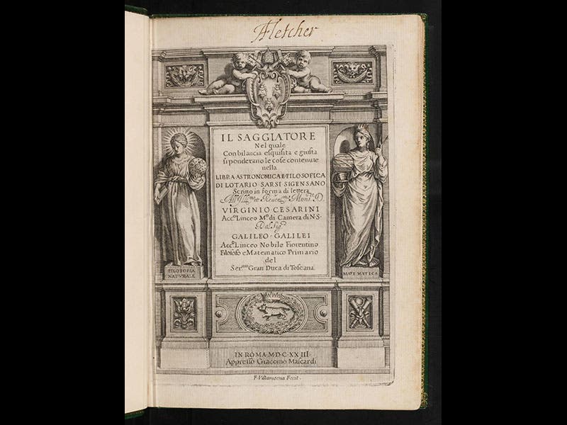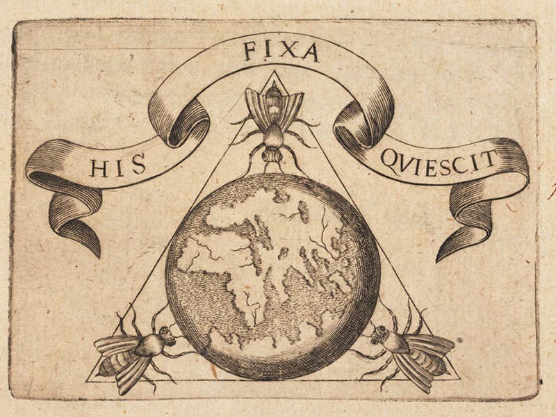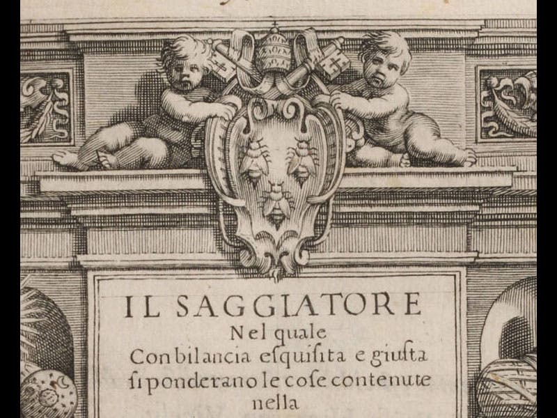 As a result of Inchofer's report, Galileo was tried on charges of heresy, and he was forced to recant his views and submit to life-long house arrest (Inchofer had no role in the trial itself). As soon as his report was submitted, Inchofer proceeded to write a short treatise, the Tractatus syllepticus (literally Short treatise, 1633) reiterating that heliocentrism is heretical. We have this book in our History of Science Collection, and an interesting feature is the engraved vignette on the title page (see first image above). It shows an earth, held in place by three bees, with the motto: "His fixa quiescit". One must remember that the crest of Pope Urban VIII was a set of three bees, as we see at the top of Galileo’s Assayer (1623), dedicated to the new Pope (second and third images). So Inchofer was slyly suggesting on the title page that the earth does not move because the Pope says it doesn’t, and the motto confirms this: "Fixed by these [!the!], it [!the!] remains quiet" (the full title page is shown in the fourth image).