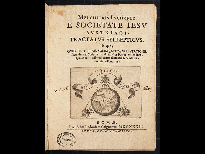 As a result of Inchofer's report, Galileo was tried on charges of heresy, and he was forced to recant his views and submit to life-long house arrest (Inchofer had no role in the trial itself). As soon as his report was submitted, Inchofer proceeded to write a short treatise, the Tractatus syllepticus (literally Short treatise, 1633) reiterating that heliocentrism is heretical. We have this book in our History of Science Collection, and an interesting feature is the engraved vignette on the title page (see first image above). It shows an earth, held in place by three bees, with the motto: "His fixa quiescit". One must remember that the crest of Pope Urban VIII was a set of three bees, as we see at the top of Galileo’s Assayer (1623), dedicated to the new Pope (second and third images). So Inchofer was slyly suggesting on the title page that the earth does not move because the Pope says it doesn’t, and the motto confirms this: "Fixed by these [!the!], it [!the!] remains quiet" (the full title page is shown in the fourth image).