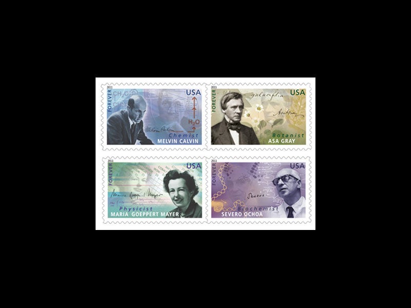 Calvin’s success at unraveling the carbon pathway brought him the Nobel Prize in Chemistry in 1961. Interestingly, the prize the year before had gone to Willard Libby, who had figured out how to use naturally occurring carbon-14 as a tool for archaeological dating. Melvin was further rewarded with a postage stamp in 2011, when he was included in the third issue of the American Scientists collection. These were issued every three years, beginning in 2005, and so far only 12 American scientists have been so honored. In the photograph of the block of four above, Calvin is at the upper left (fourth image). If the stamp were a reliable guide (which it is not), it would appear that Calvin had discovered that, during photosynthesis, H20 is converted to USA, a very exotic compound of uranium, sulfur, and argon.