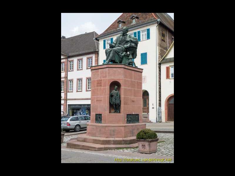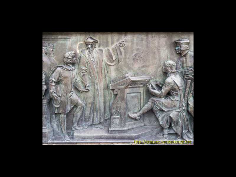 Maestlin is remembered by one woodcut portrait (first image above). There is also a monument to Johannes Kepler in his home town of Weil-der-Stadt (second image) that is adorned with statues of the four important astronomers who greatly influenced Kepler. Maestlin is one of those four, along with Copernicus, Tycho Brahe, and Jost Burgi; we see Maestlin’s niche statue as our third image. Also on the Kepler memorial are several plaques, one of which (fourth image) depicts Maestlin, the bearded teacher, instructing young Kepler and his fellow students.