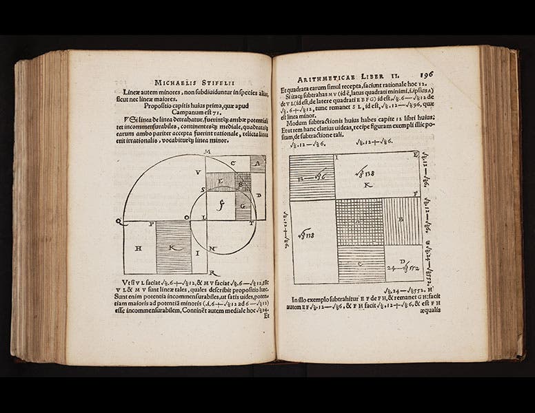 The Arithmetica was published by Johannes Petreius of Nuremberg, who was the foremost publisher of scientific and mathematical treatises in all of Germany, if not Europe. Just the year before, Petreius had published the De revolutionibus of Nicolaus Copernicus. Indeed, the small illustrated initial letters used to begin the chapters in Stifel's book (fourth image) are the very same ones that begin the chapters in the Copernican book, as one of our former fellows, Karl Galle, pointed out to us. How, one wonders, did Stifel happen to land Petreius as his publisher? Stifel had no track record as an author, so why did Petreius take a gamble on him? How did Petreius even know about Stifel? One might suspect that Georg Joachim Rheticus, the Wittenberg mathematician who brought the Copernicus manuscript to Nuremberg, might have had something to do with this.