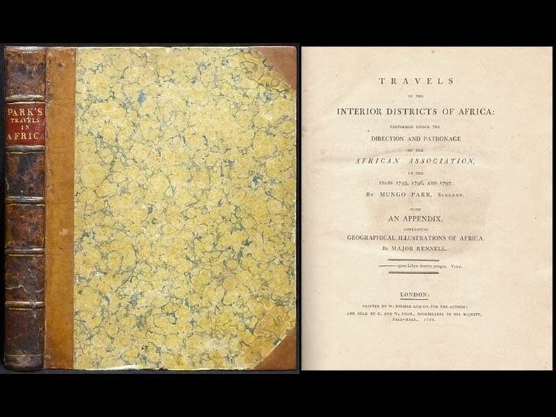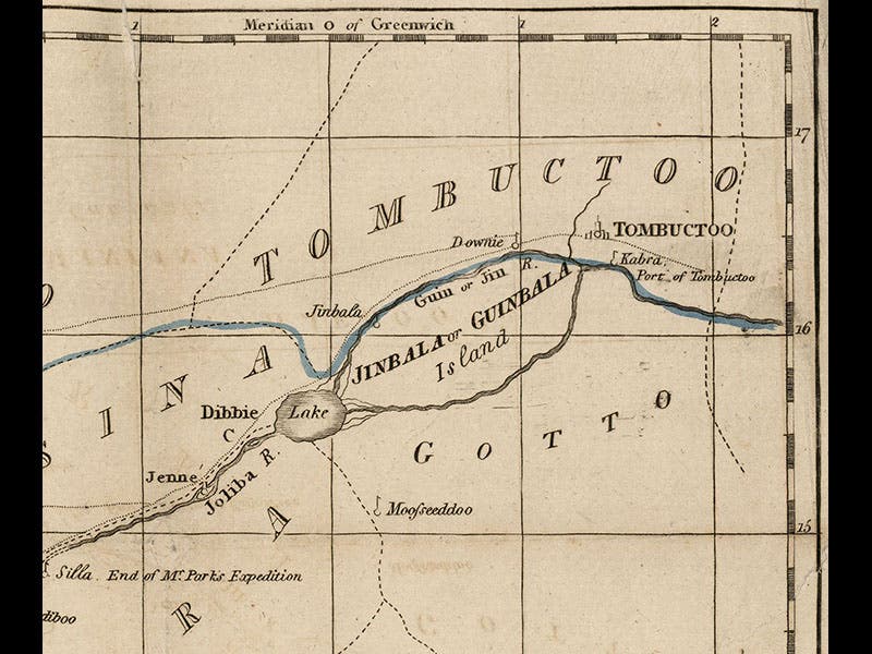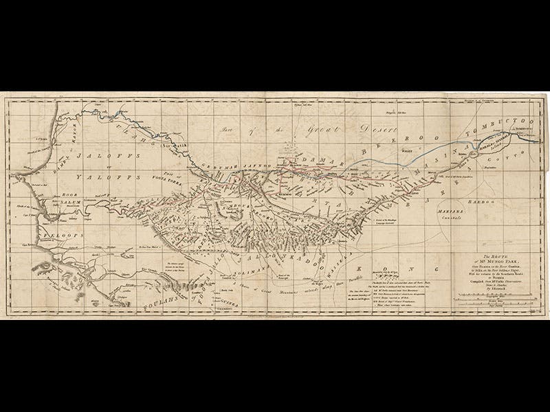 He published a book of his adventures in 1799 that was well received (see second image above). The book contains a splendid map of northwest Africa (third image), and in a detail we can see the track of the expedition and the fabled Timbuctoo (fourth image). Park then married and returned home to Scotland to become a country surgeon. When he was asked in 1803 if he would lead a better-outfitted expedition back to the Niger, with hopes of navigating to its mouth, he eagerly agreed. The second expedition was a disaster; of the original party of 45, 38 died of fever before they even got to the Niger. Park headed down the river with the surviving 7 in a modified flat-bottom canoe. If the one surviving native witness was reliable, they made it 1000 miles downstream to Bussa, before Park and his men drowned trying to withstand an attack by natives on shore, probably in late 1805.