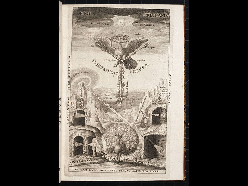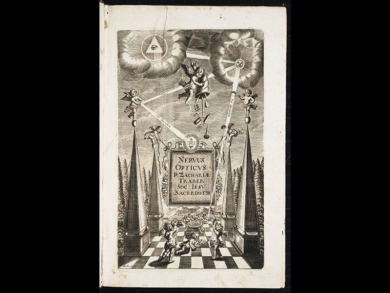 Niccolo Zucchi, an Italian Jesuit physicist, died May 21, 1670, at age 83. Zucchi is known, although just barely, for being the first to see the belts of Jupiter with a telescope in 1630, and for possibly making the first reflecting telescope, although most authorities reject this latter claim as improbable. But in 1652, Zucchi published the first volume of his Optica philosophia, and it contained an allegorical frontispiece, and although Zucchi had nothing to do with it, today he is going to bask in its light, since it is one of the finest emblematic engravings that the science of optics has ever produced. It seems appropriate to sneak up on this illustration, so the first four images above are emblematic illustrations—title pages or frontispieces—from four other works on optics published in the 17th century: Francois Aguilon’s Opticorum (1613, first image above); Christoph Scheiner’s Oculus (1619, second image); Athanasius Kircher’s Ars magna lucis et umbra (1646, third image), and Zacharias Traber’s Nervus opticus (1675, fourth image). Interestingly, all four authors, like Zucchi, were Jesuits. Although we don’t have time or space to analyze any of these four here, each is clever, rich in allusion, studded with references to debates about scientific method, but, for all the erudition on display, somehow lacking in style and drama. Zucchi’s frontispiece (fifth image) is something completely different—very simple, yet elegantly powerful, showing an eagle turned toward the sun, with a two-word motto at the bottom: Utroque potens, “powerful in both worlds”. The reason for the difference is that Zucchi's frontispiece was designed by a true artistic genius, Gianlorenzo Bernini, the Roman sculptor and painter. For his design, Bernini drew upon an ancient eulogy by Claudian about his emperor, Honorius, which explained that young eagles (like young emperors) are tested by being made to soar aloft and look directly at the sun. Those that cannot bear the light will perish, but those that can stand the sun's power will become monarchs of the air and will inherit the thunderbolt of Zeus. Since Zucchi dedicated his book to his emperor, Ferdinand II (a Habsburg, whose emblem was an eagle), the raptor does double-duty here, suggesting that Ferdinand too is "powerful in both worlds." This is the only book illustration that Bernini ever did, and it makes us at once rejoice, and regret that he never ventured another. Dr. William B. Ashworth, Jr., Consultant for the History of Science, Linda Hall Library and Associate Professor, Department of History, University of Missouri-Kansas City. Comments or corrections are welcome; please direct to ashworthw@umkc.edu.