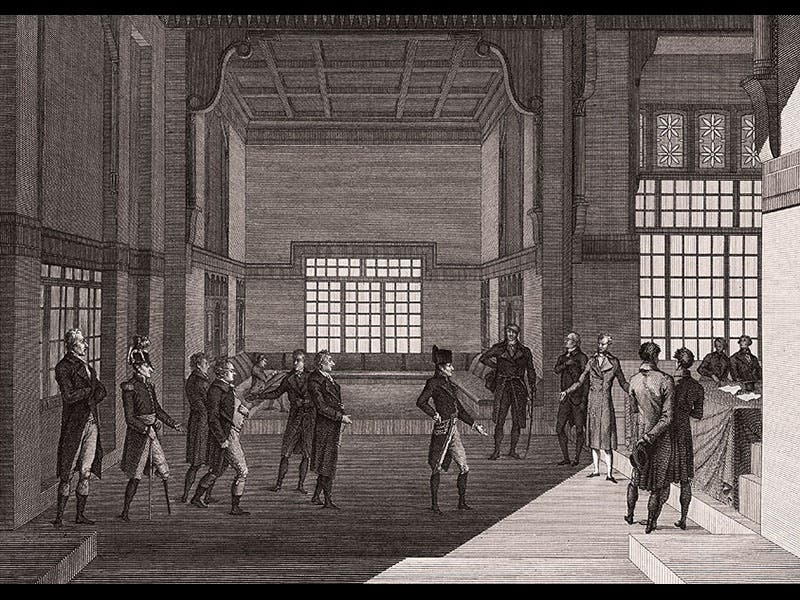 Conté lost an eye in an early explosion, and in the famous group portrait of the scientists of the Institute of Egypt (first image), Conté is easy to spot, with his rakish eye patch, standing just behind Napoleon.