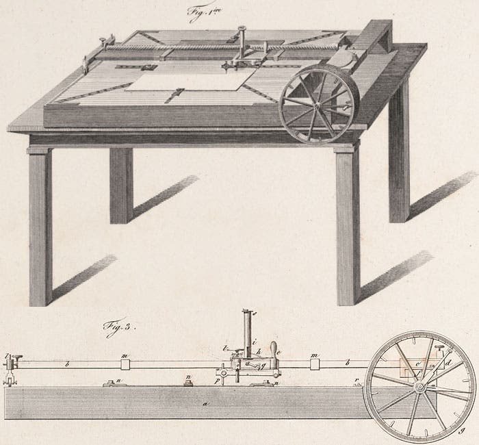 But perhaps his greatest contribution was the invention of an engraving machine (fourth image). When it came time to publish the results of the expedition, the editors were faced with the task of engraving hundreds of extremely large plates, with much of the space filled with the Egyptian sky, which had to be shaded in. Previously the shading would have been engraved by hand and would have taken thousands of man-hours. Conté's machine could do all this laborious shading mechanically, and in a fraction of the time. It is safe to say that, without it, those grand plates of the Pyramids and the temple at Karnak would have been a lot longer emerging from the press. We featured Conté, his machine, and some of his drawings, in our 2006 exhibition, Napoleon and the Scientific Expedition to Egypt.