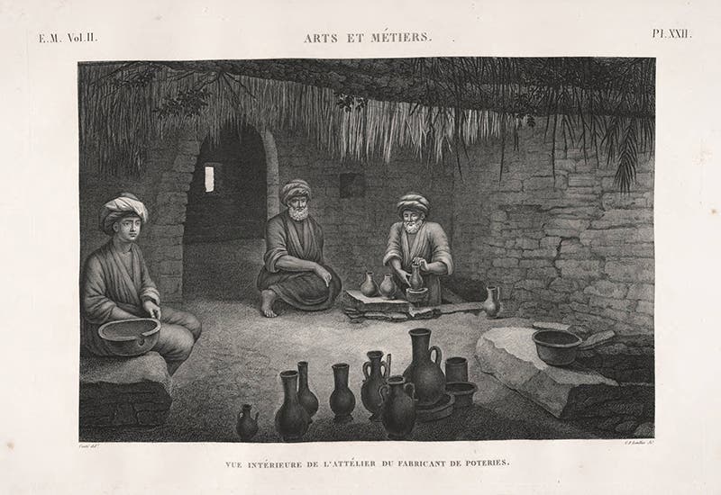 Nicolas-Jacques Conté, a French inventor and engineer, was born Aug. 4, 1755. Conté was a member of the scientific corps of Napoleon's expedition to Egypt, 1798-1801. He was a skilled machinist, and his first task was to replace all the measuring equipment that was lost when the flagship of the invasion fleet sank on arrival. After that, he gathered information on the crafts of Egypt, visiting the shops of the potters (second image), glass-blowers (third image), and blacksmiths, and making finished drawings of their tools and methods, all of which would be published in the great Description de l'Egypte (1809-1828).