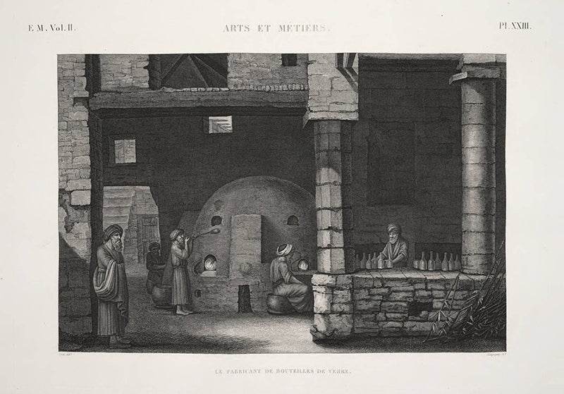 Nicolas-Jacques Conté, a French inventor and engineer, was born Aug. 4, 1755. Conté was a member of the scientific corps of Napoleon's expedition to Egypt, 1798-1801. He was a skilled machinist, and his first task was to replace all the measuring equipment that was lost when the flagship of the invasion fleet sank on arrival. After that, he gathered information on the crafts of Egypt, visiting the shops of the potters (second image), glass-blowers (third image), and blacksmiths, and making finished drawings of their tools and methods, all of which would be published in the great Description de l'Egypte (1809-1828).