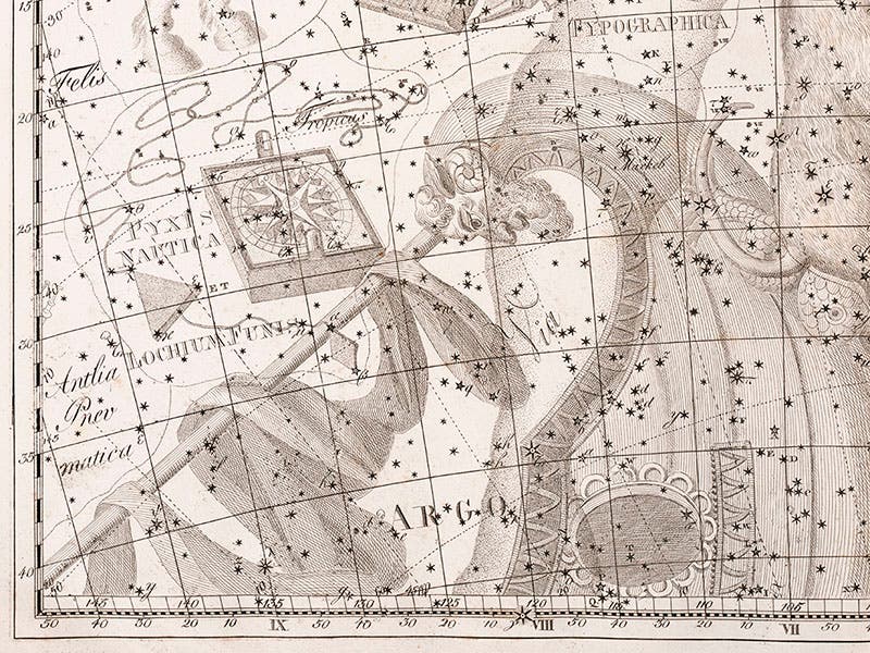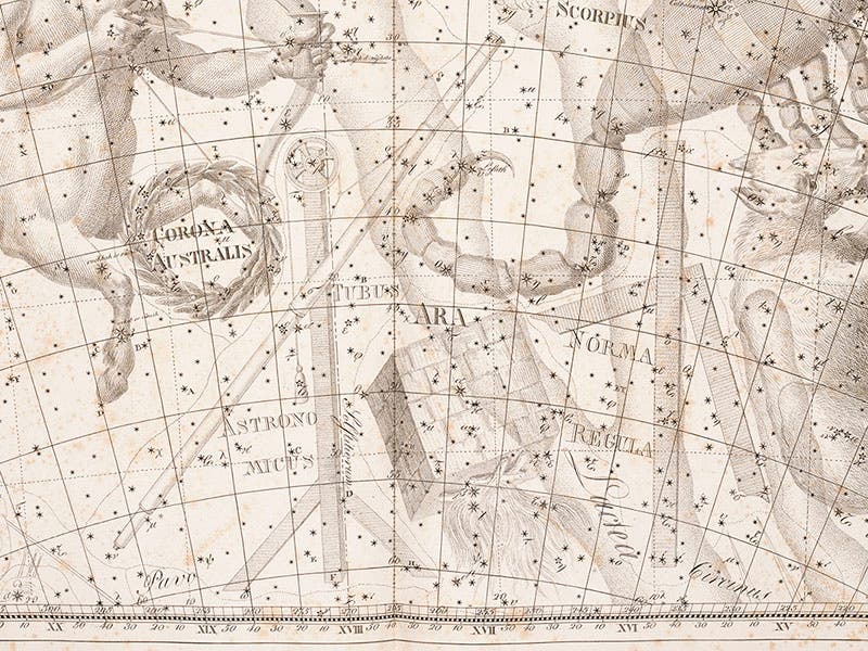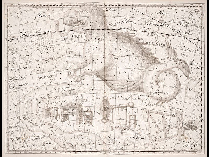 The first image above shows a detail of Lacalle’s 1752 map that includes l’Horologe (Horologium), Montagne de la Table (Mensa), le Reticule (Reticulum), and le Cheval et l’Palette (Pictor). The second image shows the entire map. The astronomer Johann bode included all 14 of Lacaille’s new constellations in his large star atlas, Uranographia (1801). In details of several of his plates, we see: Pyxis nautica (the compass; third image), and Telescopium and Norma (the square, fourth image). The fifth image shows Bode’s complete plate of Cetus; at the bottom, you can see Fornax (the furnace) at bottom left, and Sculptor (the sculptor’s studio) at bottom right. In between is Machina electrica (the electrical generator), a new constellation that was not one of Lacaille’s, nor was it later accepted into the canon of official constellations.