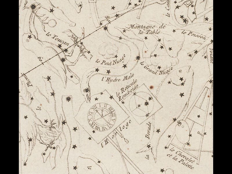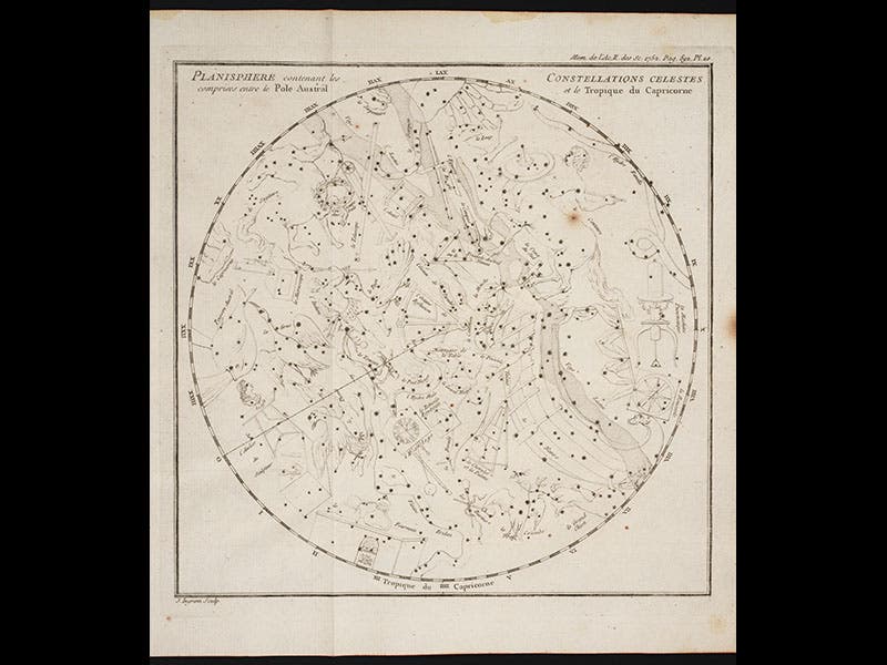 Nicolas-Louis de Lacaille, a French astronomer, was born Mar. 15, 1713. In 1751, Lacaille went to South Africa and recorded the positions of thousands of southern stars. A number of new southern constellations, such as the Phoenix and the Toucan, had been created in the sixteenth century by voyagers to the southern seas, but now Lacaille had good reason to create even more, to enclose his newly observed stars. Rather than using mythological names, or the names of exotic birds or animals, he chose to honor the achievements of experimental science. Thus his new southern constellations include Microscopium, Antlia (the air pump), Horologium (the pendulum clock), Caelum (the engraver’s burin), and ten others. These were the last constellations to be added to the now-canonical list of 88 constellations; many later astronomers tried to suggest new ones, usually in the spaces between the old ones, but they all failed to gain acceptance. Lacaille made a map of the southern skies, locating his new constellations, and it was published in the Memoires of the Royal Academy of Sciences in Paris in 1752. We displayed this map in our 2007 exhibition, Out of This World.