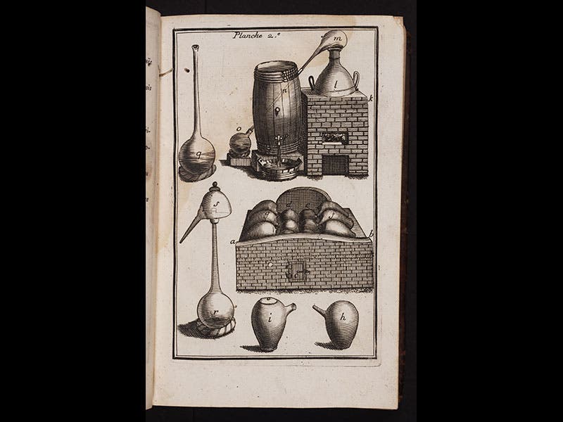 The last plate in the 1690 edition (fourth image) depicts the Bologna stone, those phosphorescent barite crystals that so fascinated 17th-century inquirers, including Galileo.  Another plate (fifth image) depicts chemical terminology and symbols of Lemery’s day, reminding us why the nomenclature reform of Lavoisier, Guyton de Morveau and others a century later was so crucial to the chemical revolution.