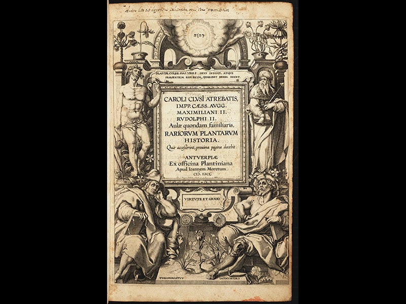 Ogier Ghiselin de Busbecq, a Flemish botanist and diplomat, died Oct. 28, 1592, at age 70. Busbecq served several Habsburg emperors in Vienna as ambassador to Constantinople. Captivated by the flowers he saw in Turkish gardens that were unknown to the West, he arranged to have bulbs and seeds sent back to his friend, Carolus Clusius, also serving the Habsburgs in Vienna, who planted them in the imperial gardens and then helped disseminate them further west. The top of the engraved title page to Clusius's Rariorum plantarum historia (1601; first image above) shows four of the plants that went from Busbecq to Clusius to Europe (from left to right): turks-cap lily, dog-toothed violet, cyclamen, and crown imperial. Not included here is the most famous import from Constantinople, the tulip (but see bottom center of the entire engraving (second image).