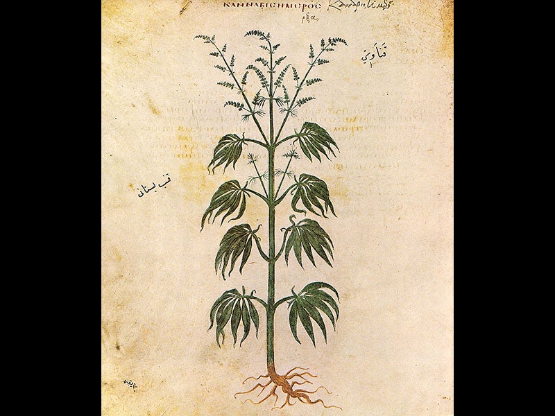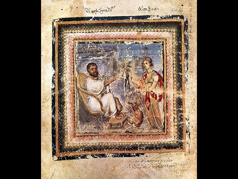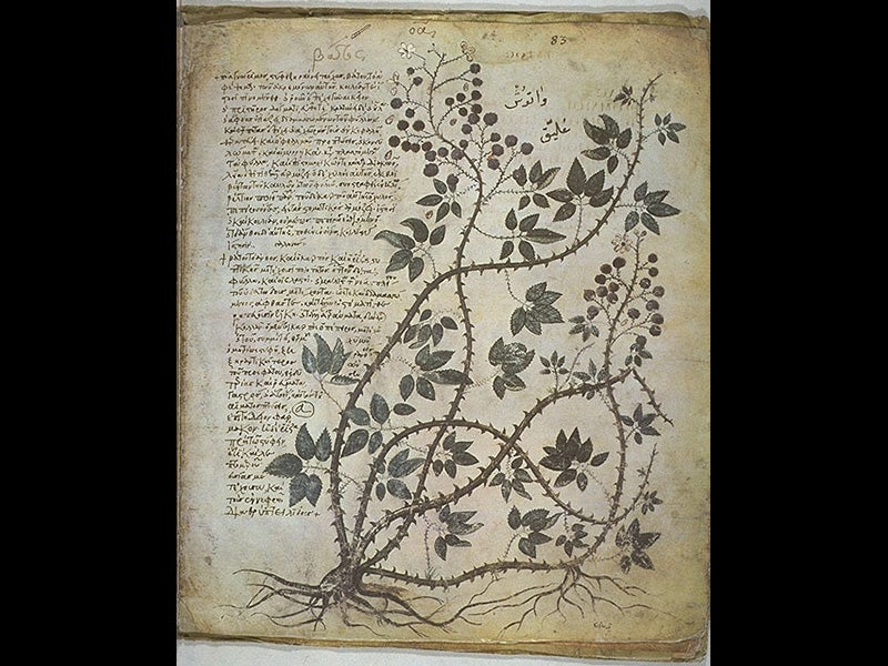 Busbecq also purchased a botanical manuscript in Constantinople that he sent back to Vienna. It was a fully illustrated copy in Greek of the De materia medica of Dioscorides, originally compiled about 60 C.E and the direct ancestor of the herbal. The manuscript was made in 512 C.E., commissioned by Princess Anicia Juliana, and it is one of the oldest scientific manuscripts in the world. It is usually referred to as the Vienna Dioscorides, or the Vienna Codex. It is important in showing us that early botanical illustrations were naturalistic, drawn from life, a characteristic that faded away in the Middle Ages and had to be rediscovered in the sixteenth century. Because the manuscript is unique—it resides in the Austrian National Library—a sumptuous facsimile was published in 1965 that managed to duplicate the look and feel of the original, which was written on vellum. We have a copy of the facsimile in our History of Science Collection. Three of the images from the Vienna Dioscorides are reproduced above: a bramble (third image), Cannabis (fourth image), and a portrait of Dioscorides (fifth image). A sixteenth-century engraved portrait of Busbecq provides our last image.