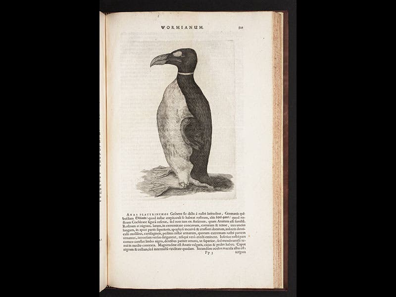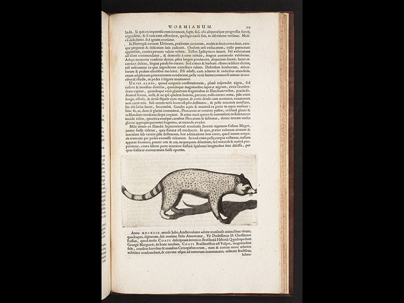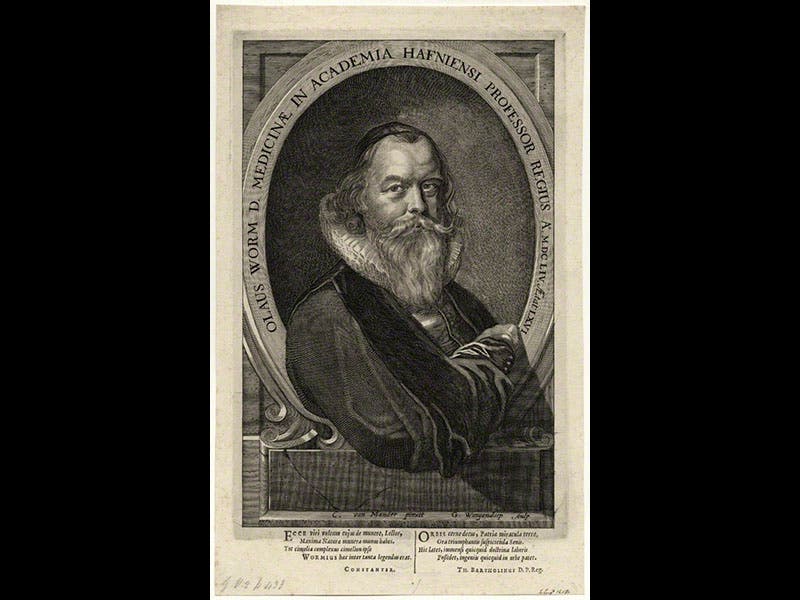 Worm’s book also contains engravings of two of his pets, a Great Auk (third image) and what he thinks is a coati, but is actually a raccoon (fourth image). There is a handsome engraved frontispiece portrait of Worm in his book, so well done that you can also find this print in the National Portrait Gallery in London (fifth image).