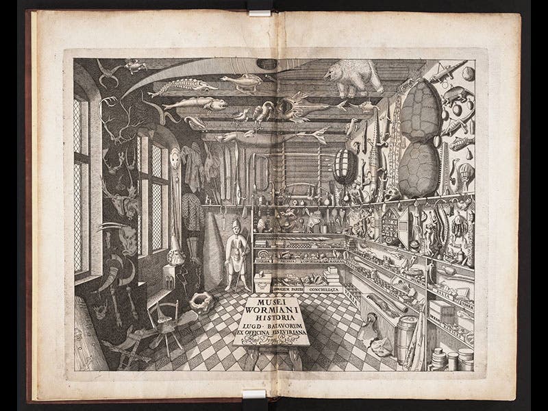 Ole Worm, a Danish physician and collector, was born May 13, 1588. Worm is best known for his Museum Wormianum, a cabinet of curiosities that he established in Copenhagen (and also the title of the posthumous book, 1655, that described and illustrated his collection). Wunderkammern (wonder-rooms) were not unusual in early modern Europe, although they tended to be assembled by rulers, noblemen or wealthy burgers, and they were usually lavishly exotic, filled with rare shells and minerals and elaborately-crafted pieces of metalwork. Worm’s museum was different, for he liked ordinary objects that related to Scandinavia, whether natural or artificial, with only the occasional exotic specimen added in. HIs book opens with an engraving of his museum—probably the most famous museum illustration of the Baroque era (first image above). You can see skis, harpoons, a stool fashioned from a whale vertebra, a kayak, and even a polar bear hanging from the ceiling. In the left corner, leaning against the wall in the window niche, there is a skull with a long horn or tusk attached. Worm was very proud of this, for he was one of the first to demonstrate (with this very skull) that the so-called unicorn horn was not the horn of a horse-like quadruped at all, but was rather the tusk of an Arctic whale.