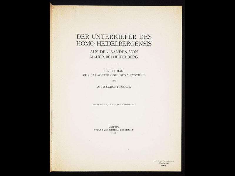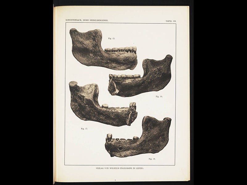 On Oct. 21, 1907, one of his workmen dug a lower jaw out of a wall in Mauer Quarry and dutifully turned it over to Schoetensack, not doubt receiving a substantial reward for his find. The fossil, a mandible or lower jaw, was human-like but not human, being heavier, with more massive teeth. In 1908, Schoetensack published a thin quarto volume, Der Unterkiefer des Homo Heidelbergensis aus den Sanden von Mauer bei Heidelberg: Ein Beitrag zur Palaeontologie des Menschen (The Lower Jaw of Homo heidelbergensis Out of the Sands of Mauer near Heidelberg: An Essay in Human Paleontology) . As the title indicates, Schoetensack had decided that the jaw represented a new species, Homo heidelbergensis. He was right. Homo heidelbergensis is now considered ancestral to both Homo neanderthanensis and Homo sapiens.