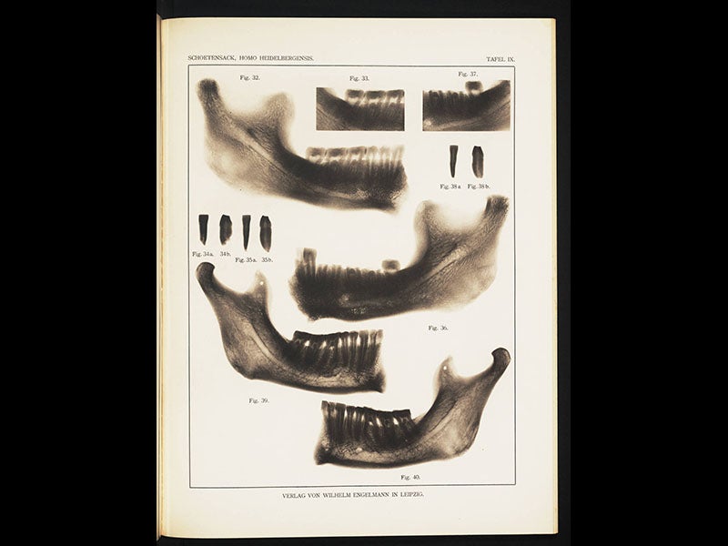 In 2012, we mounted an exhibition at the Library titled Blade and Bone: The Discovery of Human Antiquity. At the time, we did not own Schoetensack’s 1908 book, so we had to use later publications to introduce Heidelberg man and the Mauer Jaw. Last year, however, a copy of Der Unterkiefer des Homo Heidelbergensis was offered on the market, and we were fortunate to acquire it. Above we see the title page and three plates from the volume, showing side views of the Mauer jaw (third image), a top and bottom view (fourth image) and, most interestingly, a set of X-rays of the jaw (fifth image). To our knowledge, this is the first published X-ray view of any paleoanthropological object.