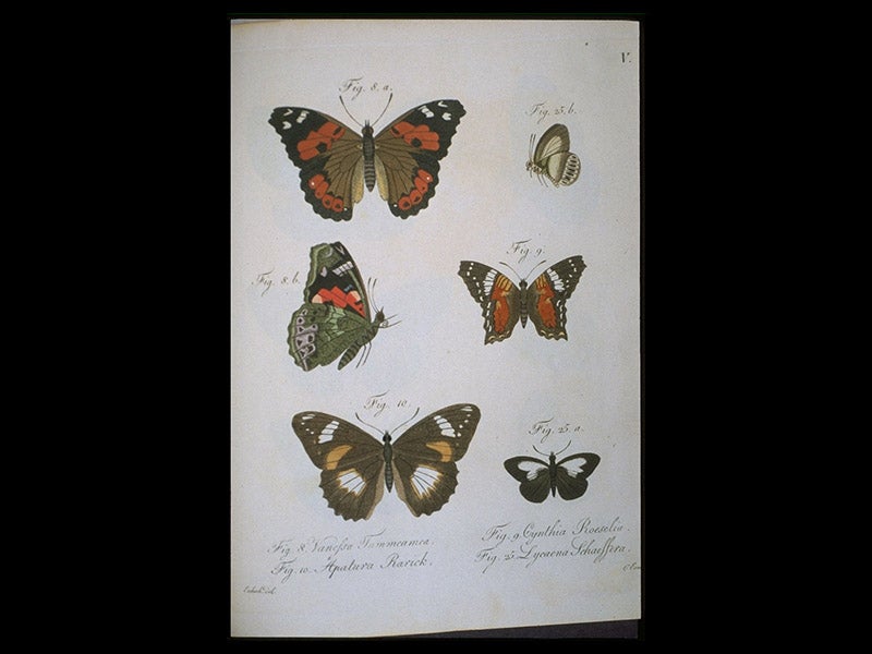 But they did make it down the west coast of North America, and then to the Hawaiian Islands, which had been discovered not long before by Captain Cook, before finally completing a circumnavigation of the globe in 1818. The narrative of Kotzebue's journey, Entdeckungs-Reise in die Süd-See und nach der Berings-Strasse (A Voyage to the South Seas and into Bering’s Strait, 1821) is in the History of Science Collection, and was displayed in our 2002 exhibition, Voyages. The first three plates above are from the Narrative and show a royal palace on Hawaii; some butterflies captured in the Hawaiian Islands, and the interior of a native hut in the Marshall Islands. The fourth image shows that path of the Rurik as it navigated around the world.