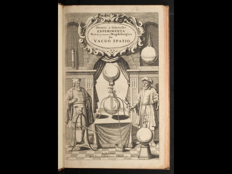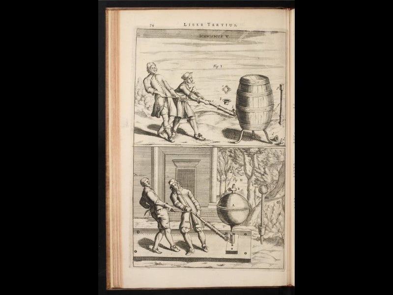 Otto von Guericke, experimental natural philosopher and mayor of Magdeburg, Germany, was born Nov. 20, 1602. In the early 1650s, when a controversy was raging as to whether there was a vacuum in the closed end of a barometric tube, Guericke set out to try to make a vacuum a different way: by evacuating the air from a container with a pump. He built the pump himself--it was similar to a modern bicycle pump, with the valves in reverse--and he also had to invent a suitable container for evacuation. He tried wooden casks sealed with pitch, but they leaked. He finally tried copper spheres, which he was able to evacuate successfully. In one of the most famous demonstration experiments of the seventeenth century, he held two copper hemispheres together to make a sphere--but did not otherwise attach them--and evacuated the air from the sphere. He then hitched each hemisphere to a team of 8 horses, and they were unable to pull the hemispheres apart. When he turned a valve and let the air back in, the hemispheres fell apart all by themselves. This demonstrated, in the most dramatic fashion, the reality of atmospheric pressure. The demonstration was depicted in Guericke’s later book, Experimenta nova (ut vocantur) magdeburgica, 1672.