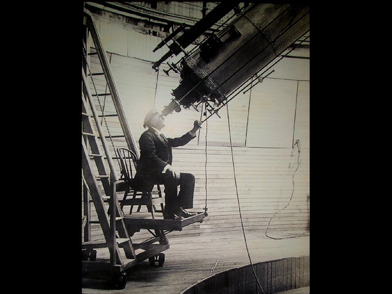 In addition, we have an odd item in the Collection, attributed to the Lowell Observatory and dated 1894, the very year the Observatory was founded. It consists of what appear to be 12 photographs of Mars, each photo pasted onto heavy card stock. The oddity is that the images are photographs of a Martian globe, rather than the planet itself, a globe that was evidently made by Lowell or the Observatory staff, depicting a Mars covered with canals. We show photo 10, featuring Syrtis Major, an important Martian feature (see first image above), and photo 4, which contains the other prominent areographical feature, Solis Lacus (second image). The third image is a detail of the second; many of the oases (large dots) that Lowell saw were probably extinct Martian volcanoes. Our fourth image shows Lowell himself at the eyepiece of his pride and joy, the 24” Clark refractor at the Lowell Observatory.