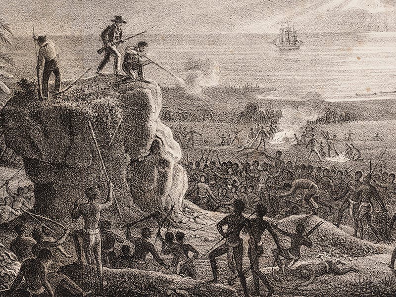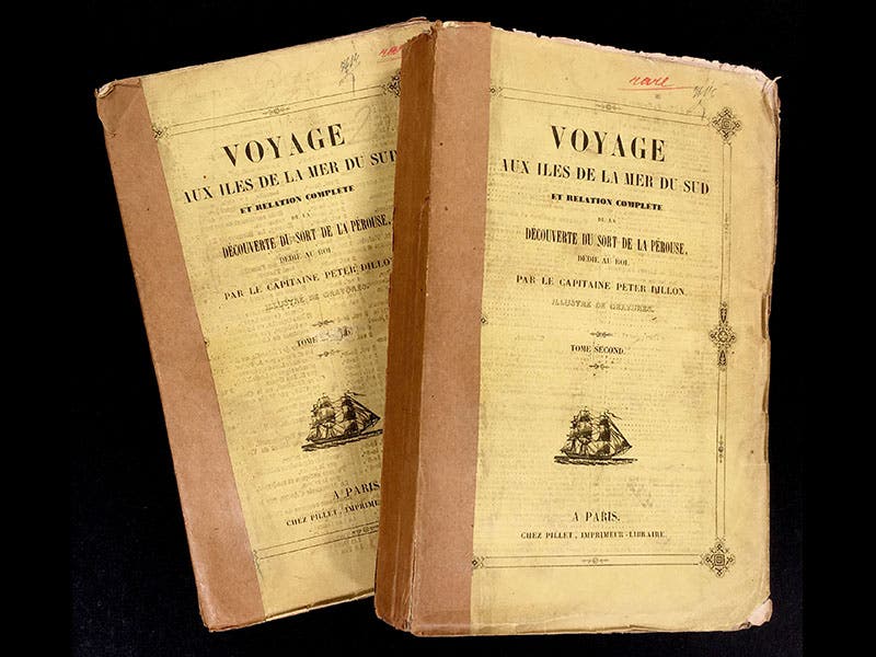 Dillon took his salvage back to Paris, where he meet Jean Baptiste Barthélemy de Lesseps, who had been with La Pérouse on the ill-fated voyage but had returned before the ships sailed for the Solomons, and Lesseps identified the articles as belonging to the Astrolabe and Boussole. Dillon wrote an account of his discovery of the fate of La Pérouse; an English version was published in 1829 and a French edition in 1830. We have the French edition in the History of Science Collection (second image); we displayed it in our Voyages exhibition in 2002, along with other works relevant to the La Pérouse expedition. The three images above are from this work; in fact, they constitute the entirety of the illustrations included in the two-volume narrative. The two scenes depict events from previous Dillon voyages; for one of them, showing Dillon and two companions making a stand on a rock against a native attack, we provide a detail, simply because it is an exciting scene (first image). The map is more relevant to our story, since it depicts Mannicolo and the spot along the reef where the ships capsized, as well as locations where other artifacts were recovered. Mannicolo is now known as Vanikoro.